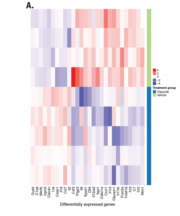 Mouse models were treated with trilaciclib and control treatments and subsequently profiled for gene expression levels using the PanCancer Immune Profiling Panel (NanoString). Fios performed the analysis of the gene expression data including normalisation, quality control, statistical hypothesis testing and pathway analysis. The identified genes and pathways were visualized using clustered heatmaps and barcharts.
